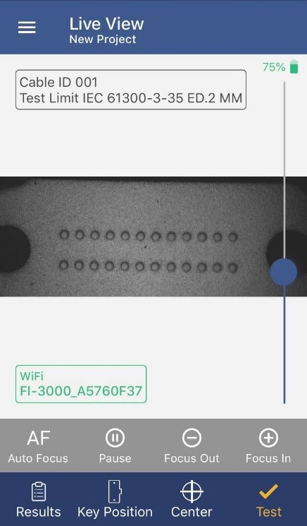 FI-3000 也可通過 Wi-Fi 連接到 iOS 或 Android 設備,適合小型作業或快速檢測。FiberInspector 應用 (FI-IN) 顯示簡單的通過/失敗結果,但可以完全控制 FI-3000,讓您可以放大或縮小各個端面并平移整個端面的實時視圖。FI-IN 支持在設備中命名和保存結果,或者將它們作為圖像或 PDF 報告發送給團隊中的其他人,以便快速、簡單地進行協作。